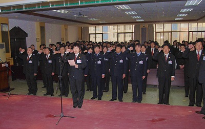 “我是中华人民共和国法院工作人员,必当始终坚持‘三个至上’;坚持‘为大局服务,为人民司法’;严格遵守‘五个严禁’……”3月30日上午9时,郑州市管城回族区人民法院近200名法官和其它工作人员,身着法官服,佩戴天平,组织有序,精神饱满,在该院五楼大审判庭里面对巨大国徽,举起右拳,进行了以“公正廉洁司法,落实五个严禁”为主要内容的集体宣誓。此次活动,该院党组高度重视,院党组书记、院长吴景禹及各党组成员均参加了会议,还特邀请郑州市中级人民法院政治部人事处处长王炅现场监誓,吴景禹作了重要讲话。