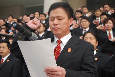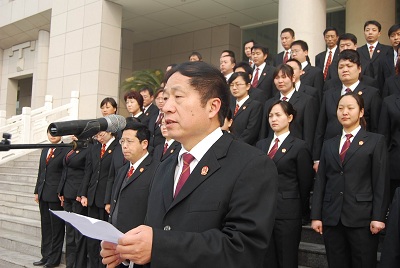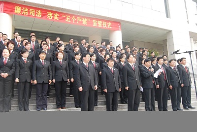 3月31日,郑州高新区法院全体人员在审判楼前举行了以廉洁司法、落实“五个严禁”为内容的宣誓仪式,市中级法院政治部副主任武自献现场监誓。