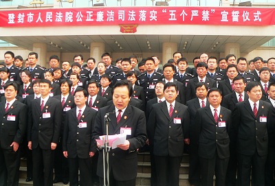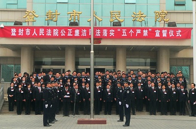 为认真落实“五个严禁”规定,强化法官及其他工作人员的责任感和使命感,培养全院人员忠于宪法和法律、永生追求公平正义的司法理念,4月1日上午,登封市人民法院在办公大楼前举行了以“公正廉洁司法,落实‘五个严禁’”为内容的升国旗仪式和法官宣誓活动。