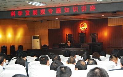 郭献功教授围绕科学发展观的提出、内涵和要求,重点讲述了科学发展观是什么、中央为什么提出科学发展观等问题,为该院干警做了一场精彩的报告。通过郭教授的讲解,该院全体干警及人民陪审员充分认识到了科学发展观的重要意义,增强了学习实践科学发展观活动重要性和必要性。也使该院在学习实践活动的开展更加深入具体、富有实效。