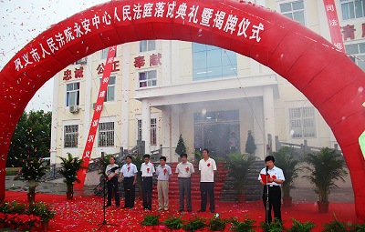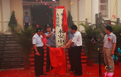 庆典最后一项,与会各级领导为永安中心人民法庭落成典礼剪彩、揭牌。