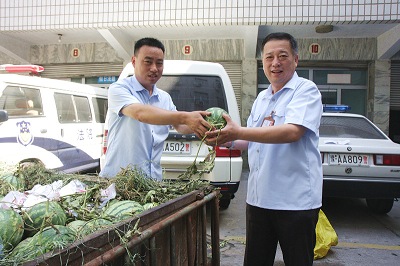 中原区法院将西瓜等防暑降温物品发放到干警手中