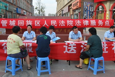 管城法院开展的“法律下基层、法官入社区”活动中,每名法官负责两个社区,与社区的民调员建立 “人对人”的联系,便于“点对点”的及时沟通,同时法官们定期到联系点与民调员进行沟通,指导工作,及时了解当地情况,将问题解决在萌芽期。“周六送法进社区”活动作为该活动的一个组成部分,自开展以来已深入到辖区内多个社区,现场为社区群众就物业纠纷、离婚纠纷、继承纠纷、货运纠纷等领域的问题进行答疑释法,收效良好。管城法院司法“上门服务”,切实给群众带来了实惠与便利,有效增进辖区社会的和谐与稳定。