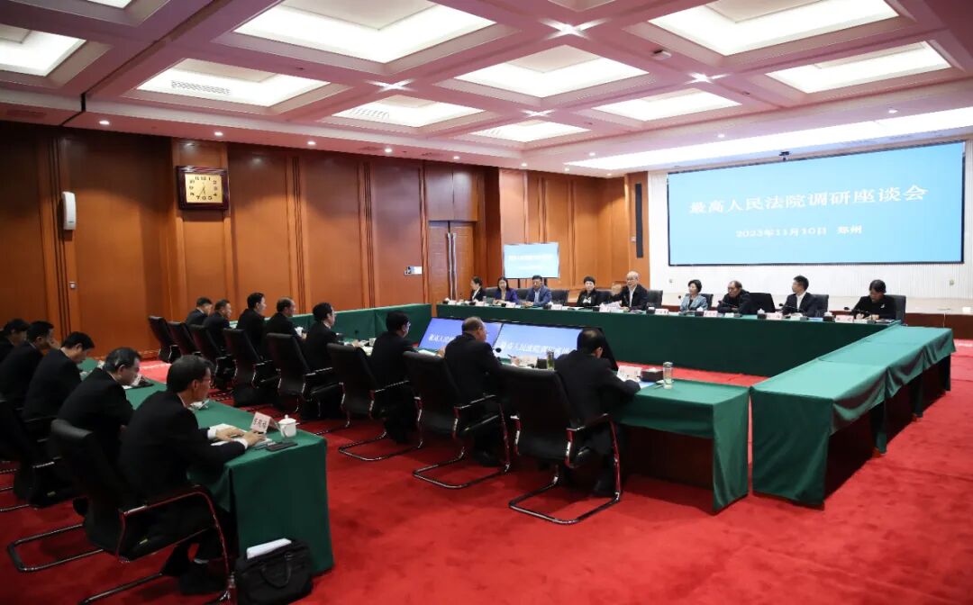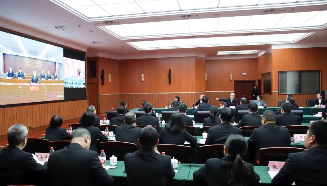 调研组在河南省高级人民法院与全国人大代表、全国政协委员一同听取河南法院工作情况介绍并座谈。