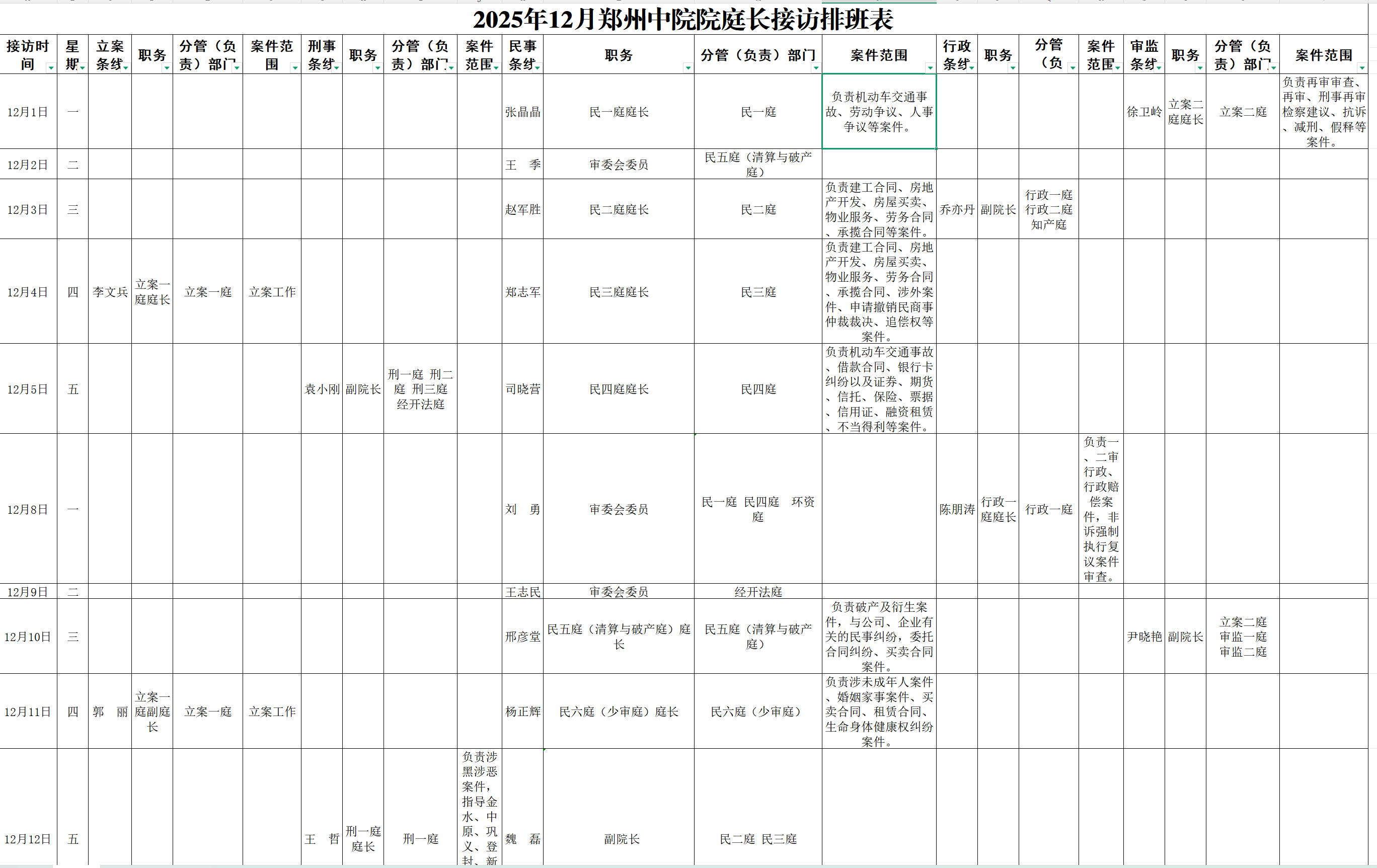 2025年12月郑州中院院庭长接访排班表