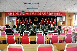 为使新进人员更深刻领会“为大局服务,为人民司法”理念,更快熟悉新的工作环境,更早适应工作岗位,郑州市中级人民法院对24名新录用公务员进行为期一周的岗前培训。10月20日下午,岗前培训开学典礼在中牟武警总队训练基地举行,党组成员、政治部主任高延安,政治部副主任丁岩,政治部副主任兼人事处处长王炅,中牟武警总..