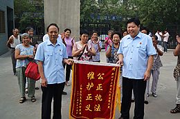 7月20日上午,上街法院大门口热闹非凡,上街区任庄村第六村民组村民二十余人自发来到该院放鞭炮、送锦旗,对该院法官公正判决的行为表示感谢。上街法院民事审判二庭在处理一起牵涉到二十三年前的土地承包合同纠纷案时,主审法官秉公执法,依法进行了深入细致的调查,赢得了人民群众的一致认可。当该院法官接过锦旗时,现..