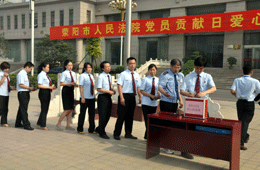 6月30日上午,荥阳法院办公楼前,119名党员身着庄严的法官制服走到台前,郑重向鲜红的捐款箱内投进一片片爱心。这是该院在迎接建党90周年前夕组织的“共产党员献爱心”活动现场。当天,来自全院各部门的全体党员现场捐款总额达5100元。“共产党员献爱心”活动是荥阳法院每年“七一”都要举办的重要活动。作为司法机..